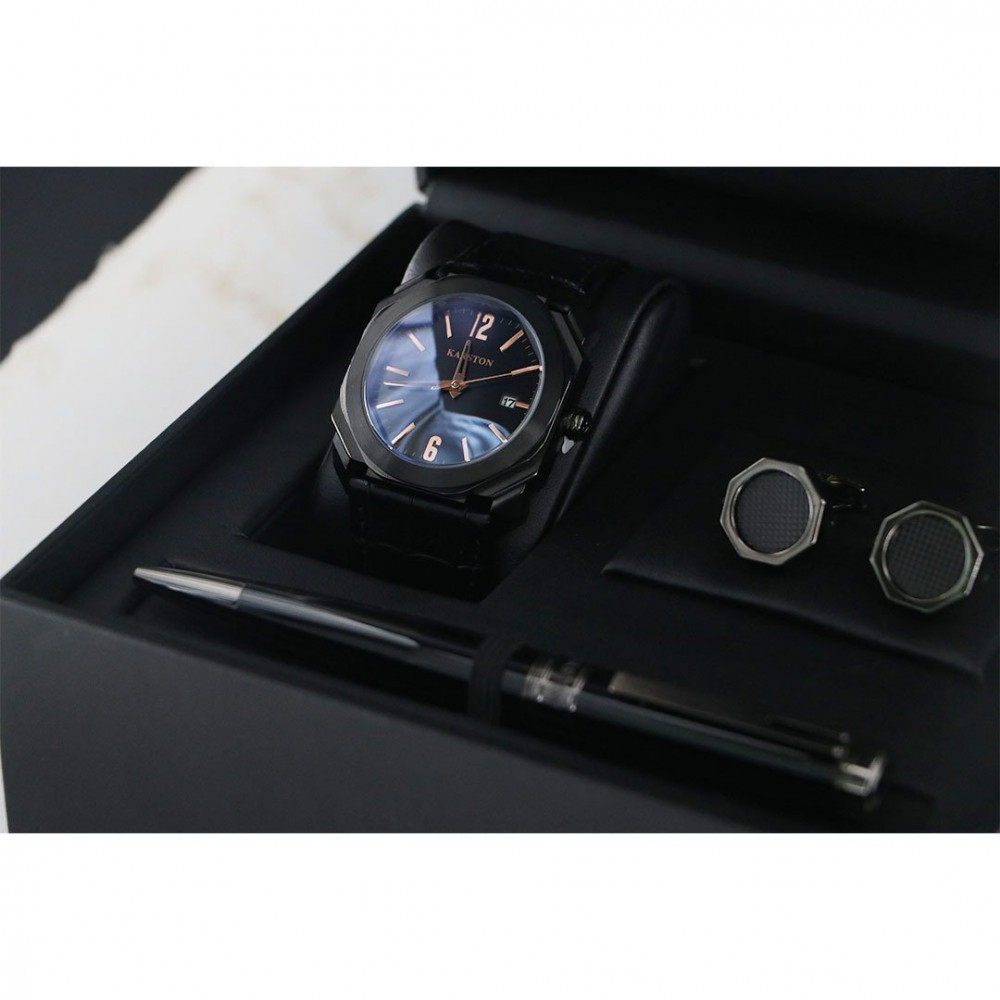 طقم كارستون طقم مميز وفاخر للاستخدام الشخصي أو لهدية مميزة ،تصميم بشكل ثماني، طقم كارستون موديل 18 بلونه الأسود يتكون من كبك وقلم و ساعة ، طقم كارستون كل ما يلزمك لإطلالة فاخرة.